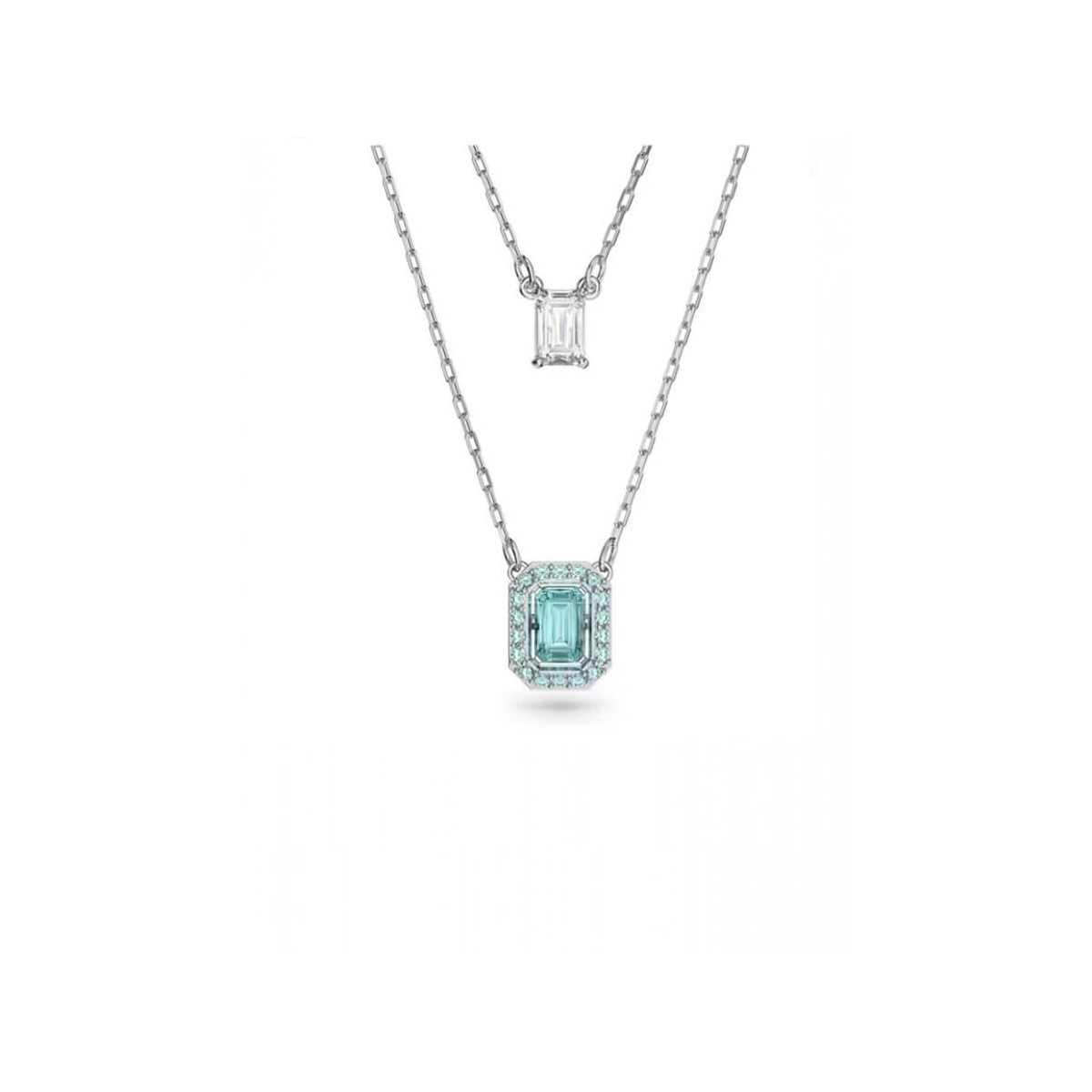 Damenhalskette von Swarovski aus der Millenia-Kollektion, aus einer rhodinierten Legierung, bestehend aus einem doppelten Strang mit weißen und blauen achteckigen Anhängern, die mit einem Ton-in-Ton-Pavè-Rahmen verziert sind. Verstellbarer Verschluss mit Karabinerhaken.