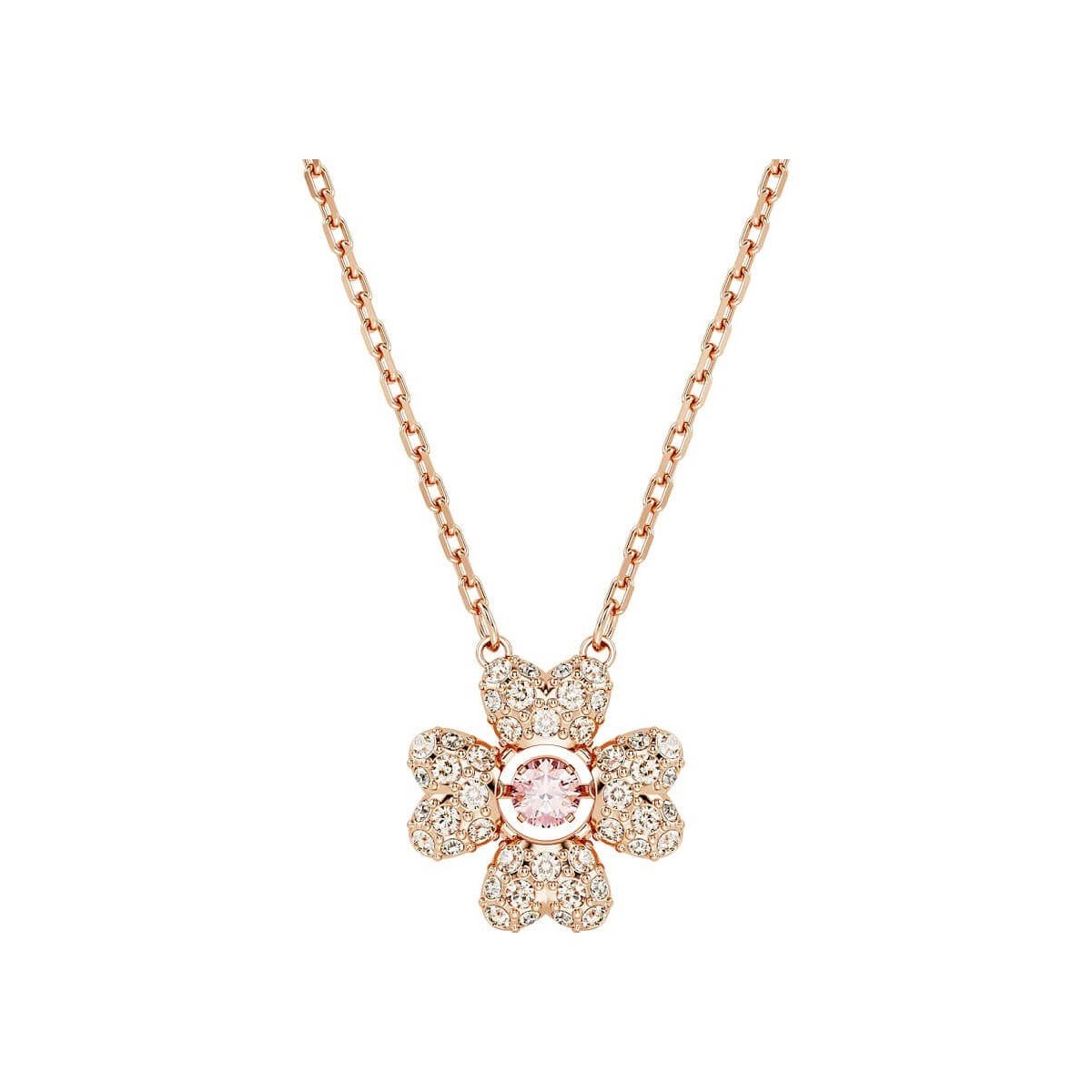 Vierblättriges Kleeblatt-Halskette für Damen von Swarovski aus der Idyllia-Kollektion, rosévergoldet. Dieses Design besteht aus vier rosa herzförmigen Swarovski-Zirkonia, die wie Blätter um einen zentralen Tanzstein angeordnet sind. Karabinerverschluss mit Verlängerung.