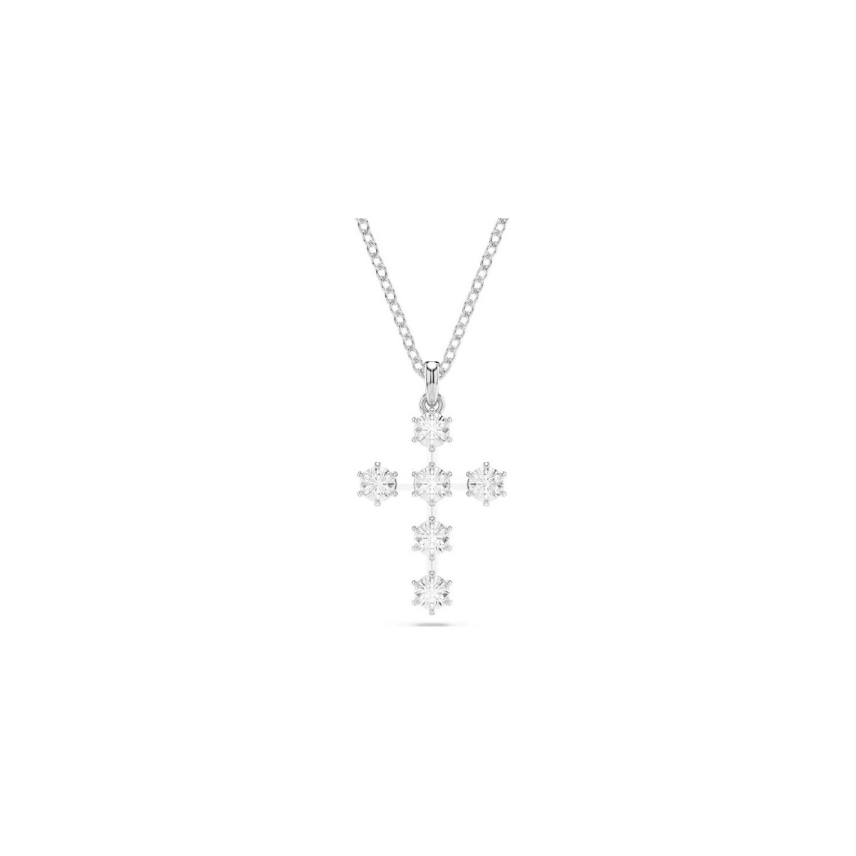 Swarovski-Kreisel-Halskette für Damen aus der Insigne-Kollektion, hergestellt mit Rhodiumbeschichtung. Das Schmuckstück verfügt über einen Anhänger mit Kreuzmotiv, der mit sechs weißen Kristallen verziert ist.
