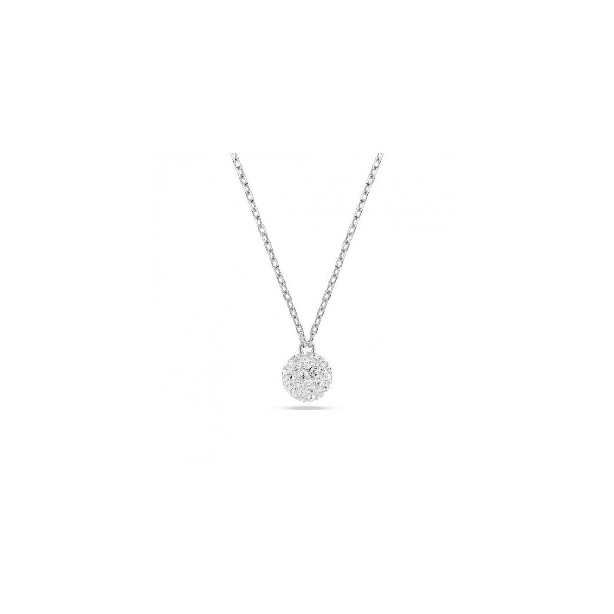 Von Swarovski signierte Halskette aus der Dextera-Kollektion. Die Halskette besteht aus einer Metalllegierung mit Rhodium-Finish und verfügt über einen runden Anhänger mit einem Pavé aus weißen Kristallen.