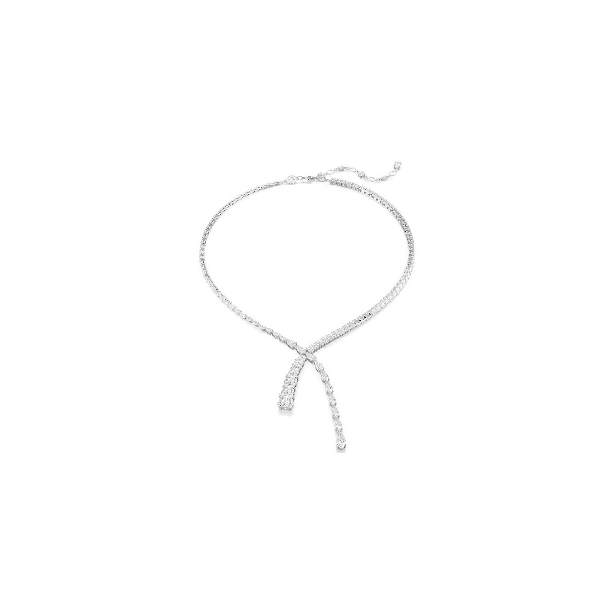 Y-förmige Halskette im Mischschliff aus der Matrix-Kollektion für Swarovski-Damen, die das Zusammenspiel von Geometrie und Licht verstärkt. Die Halskette ist rhodiniert und mit einer Vielzahl transparenter Swarovski-Zirkonia in verschiedenen Größen sowie im Birnen- und Quadratschliff verziert. Karabinerverschluss.