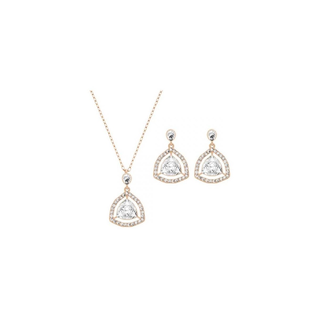 Der Klassiker, hier interpretiert in klarem Kristall und versilbertem Metall, Rosa-gold, Parure umfasst Ohrringe und Anhänger mit einer Kette für eine Einrichtung, die die richtige Menge an Helligkeit zu Ihrem Satz, beide formalen, informellen hinzufügt.