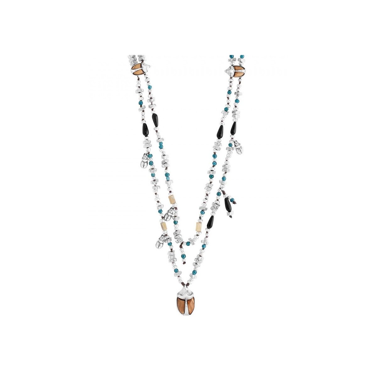 Zwei lange Halskette Frauen Baumwolle verziert mit Knoten, Perlen aus verschiedenen Materialien und Größen, Silber vergoldet-Nuggets und Käfer-förmigen Anhänger aus gebürstetem Olivenholz gemacht