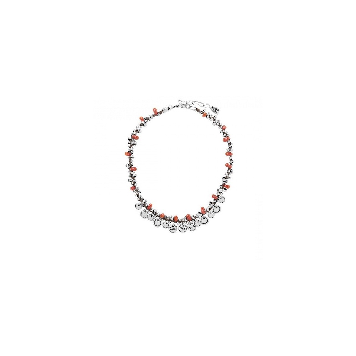Halskette aus kleinen roten Glasperlen in roten und silbernen Perlen, darunter unterschiedene Stücke mit "Liebe, Gesundheit und Glück" geschrieben. Dieses exklusive Juwel von UNOde50 ist in Spanien handgefertigt. Länge 15-19 cm