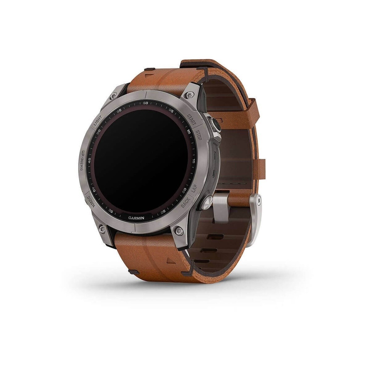 Multifunktions-Smartwatch fenix® 7 Shaappire Solar Titanium Line mit Chestnut-Lederarmband. GPS, Pulsmesser, Multisport-Profil, Bluetooth