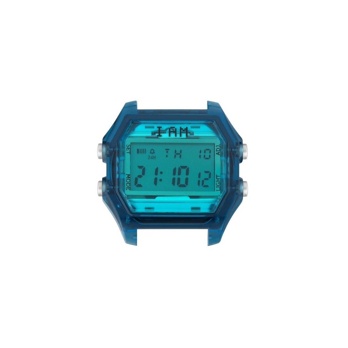 Großes I AM-Uhrgehäuse aus transparentem Idaco-Polycarbonat mit vier grauen Knöpfen, Türkiszifferblatt und digitalem Quarzwerk - IAMTHEWATCH