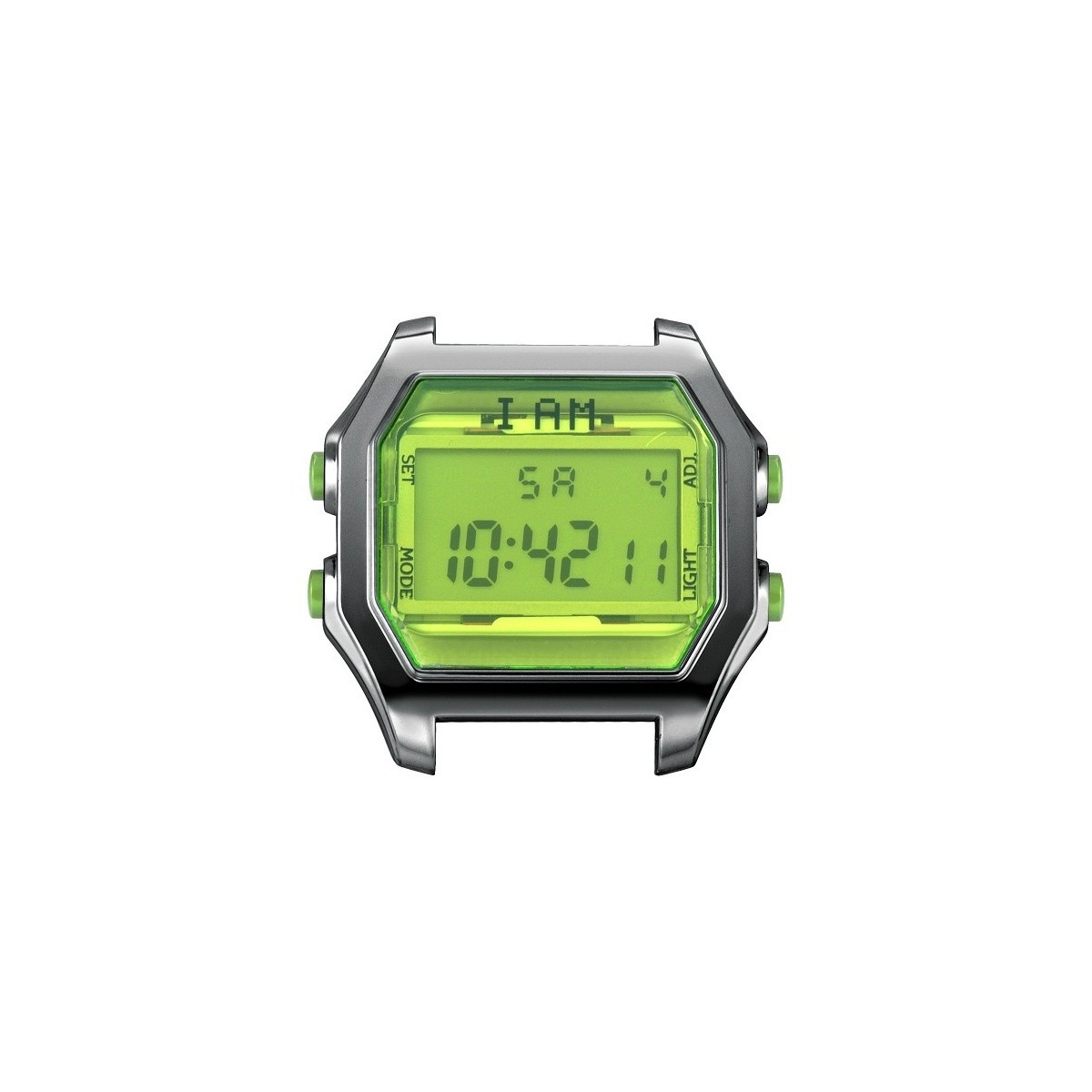 Großes I AM-Gehäuse aus poliertem Metalleffekt-Polycarbonat mit vier neongrünen Knöpfen, fluoreszierendem grünem Zifferblatt und digitalem Quarzwerk - IAMTHEWATCH