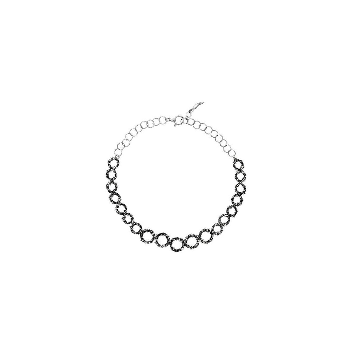 49 m Choker-Halskette, aus der Millefiori-Kollektion, aus 925 brüniertem Silber, bestehend aus Kreisen, die mit kleinen Blumen verziert sind, handgefertigt im Wachsausschmelzverfahren, hier manifestiert sich das Licht durch die Diamantschlifftechnik, die den winzigen silbernen Blütenblättern einen schimmernden Effekt verleiht , im Gegensatz zu der polierten Kette und Basis. Karabinerverschluss mit Einstellgliedern.