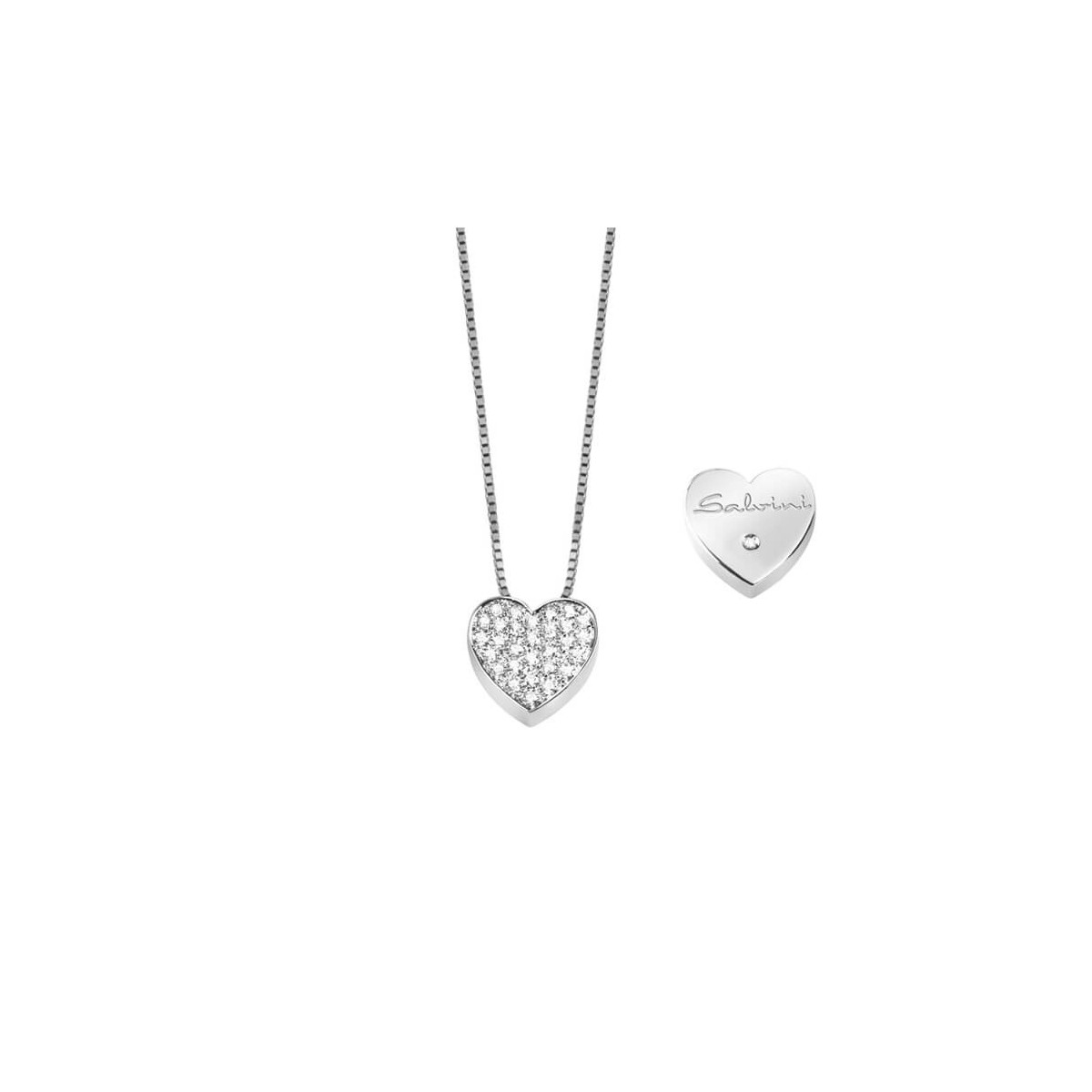 Halskette aus 18 kt Weißgold mit mittelgroßem Herzanhänger aus der I SEGNI-Kollektion und natürlichem Diamantpavé und Salvini-Logo mit Diamant auf der Rückseite