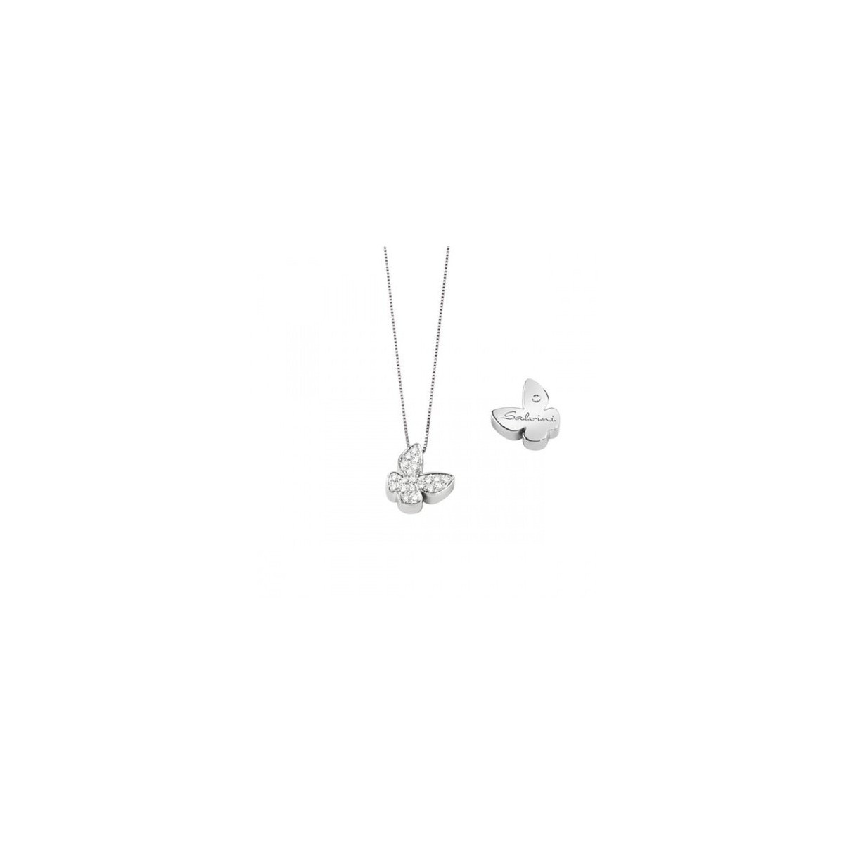 18-karätige Weißgold-Halskette mit Schmetterlingsanhänger aus der I SEGNI-Kollektion und Pavé aus Naturdiamanten und auf der Rückseite Salvini-Logo mit Diamant