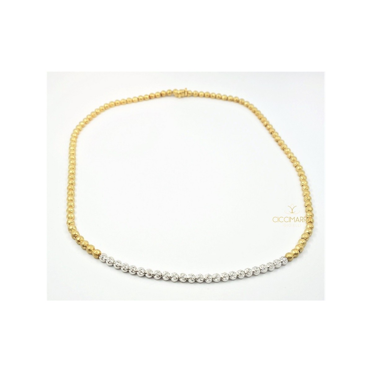 Gelenk halbstarre Chokerhalskette, in Gelbgold und 18kt Weißgold gehämmert und Satin mit Kugeln mit natürlichen Diamanten