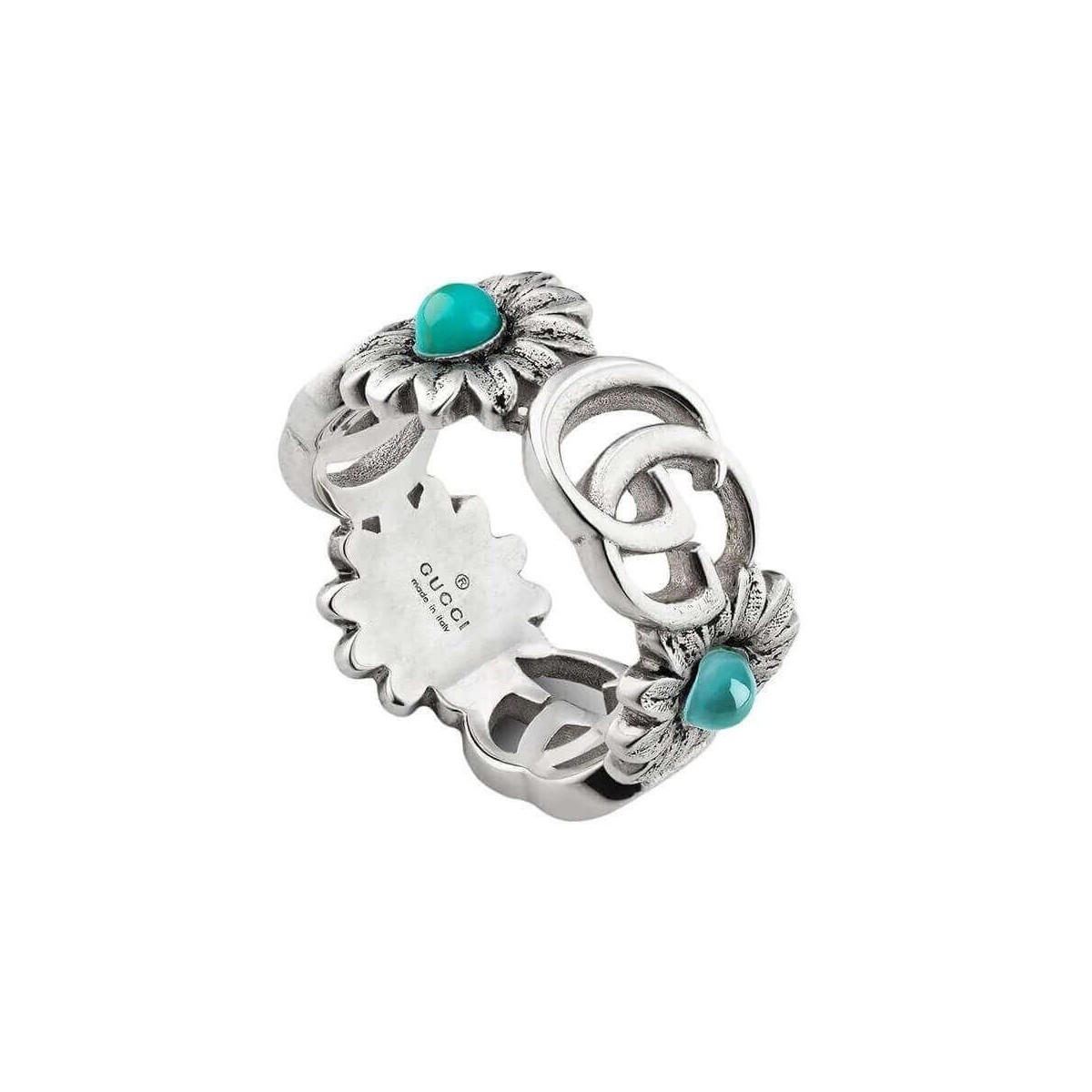 Bandring aus der Marmont-Kollektion aus 925er Silber mit Antik-Finish, mit Blumen mit türkisfarbenen Harzsteinen, blauen Topasen und Perlmutt. Das Symbol der Maison, das Doppel-G, ziert diesen Ring und wechselt sich mit Blumen ab, die in der Mitte mit einem türkisfarbenen Harzstein verziert sind. Maßnahme 14