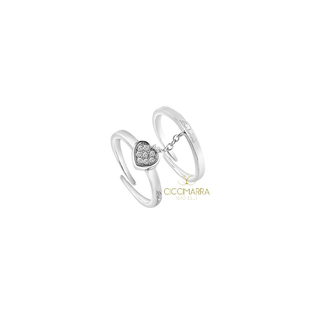 375/1000 Goldring, bestehend aus zwei Ringen, die mit einer Kette verbunden sind, einem Ring mit einem einfachen Band und einem Ring mit einem zentralen Herz, auf dem ein Pflaster aus 8 Diamanten im Brillantschliff steht.