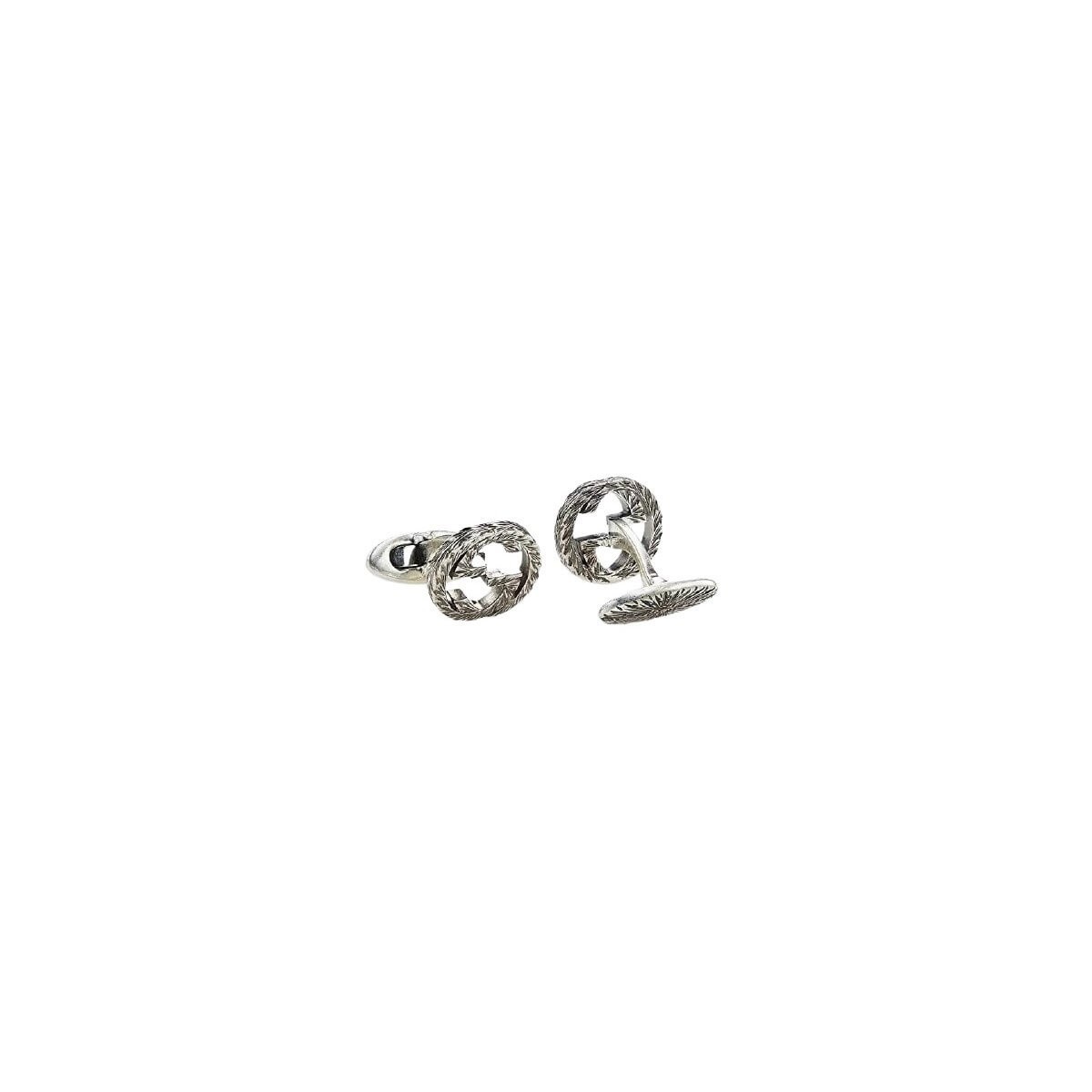 Gucci Herren-Manschettenknöpfe aus der Interlocking-Kollektion aus bearbeitetem und brüniertem 925er Silber. Mit einem strukturierten und detaillierten Finish mit ineinandergreifendem Doppel-G-Logo verleihen diese Schmuckstücke am Handgelenk Ihrem Hemd eine skurrile Note.