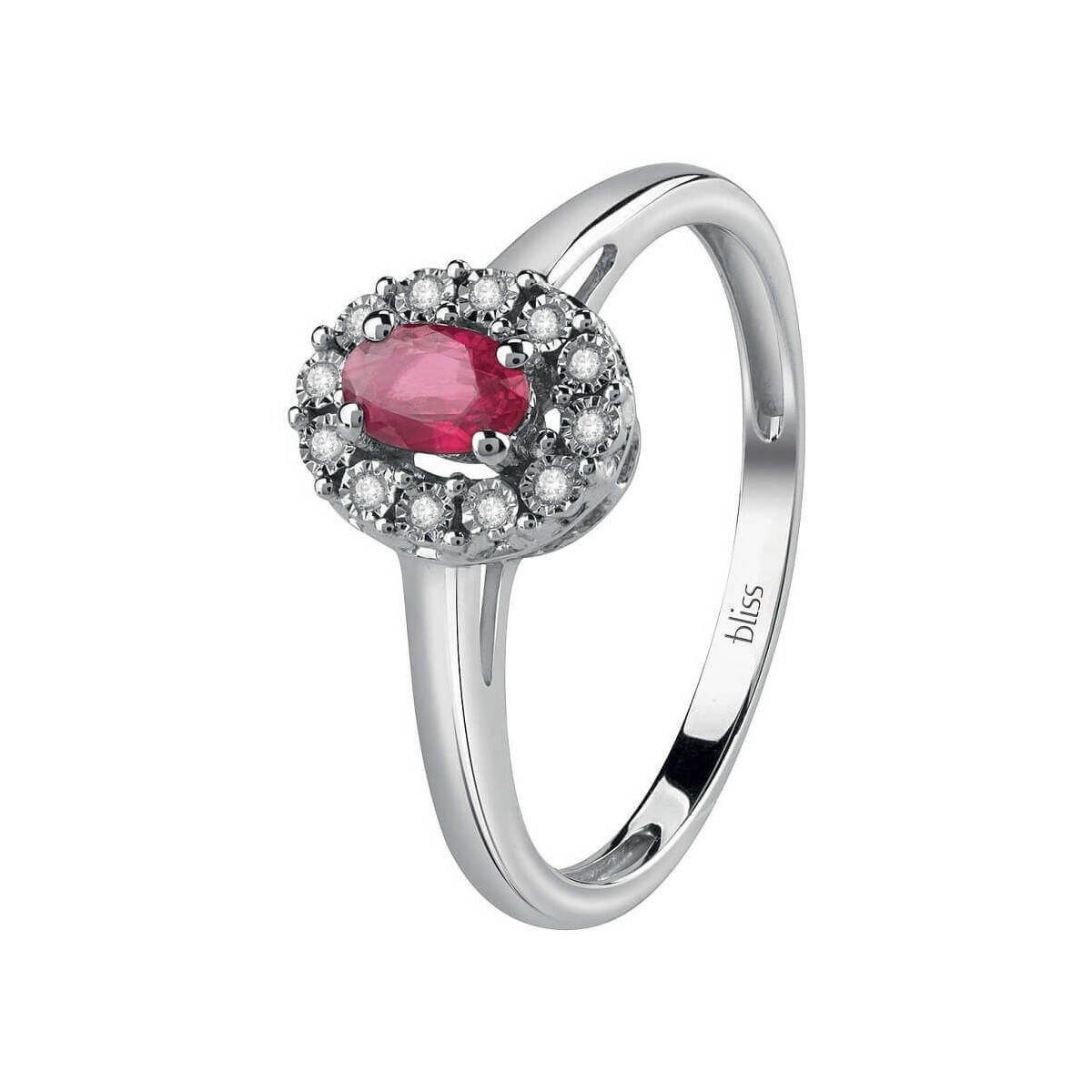 Bliss-Damenring aus der Regal-Linie aus 18-karätigem Weißgold mit einem 0,35-karätigen roten Naturrubin im Brillantschliff, umgeben von 0,04-karätigen Naturdiamanten im Brillantschliff