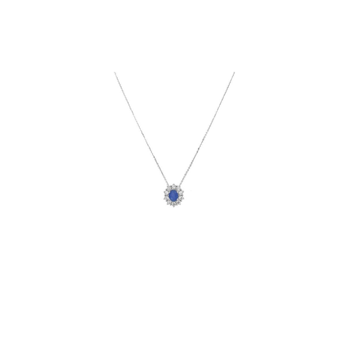 Damenhalskette der Charleston Collection aus 18 Karat Weißgold mit natürlichem blauen Saphir von 0,35 Karat, umgeben von Diamanten von 0,15 Karat.