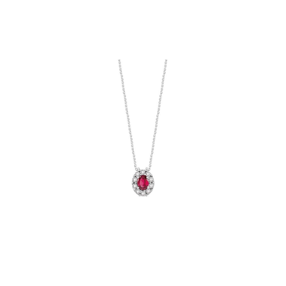 Gyro-Halskette für Damen von Bliss aus der Regal-Kollektion aus 18 Karat Weißgold mit einem zentralen natürlichen Rubin im Ovalschliff von 0,22 Karat, verziert mit einer Krone aus 10 natürlichen Diamanten im Brillantschliff von 0,05 Karat.