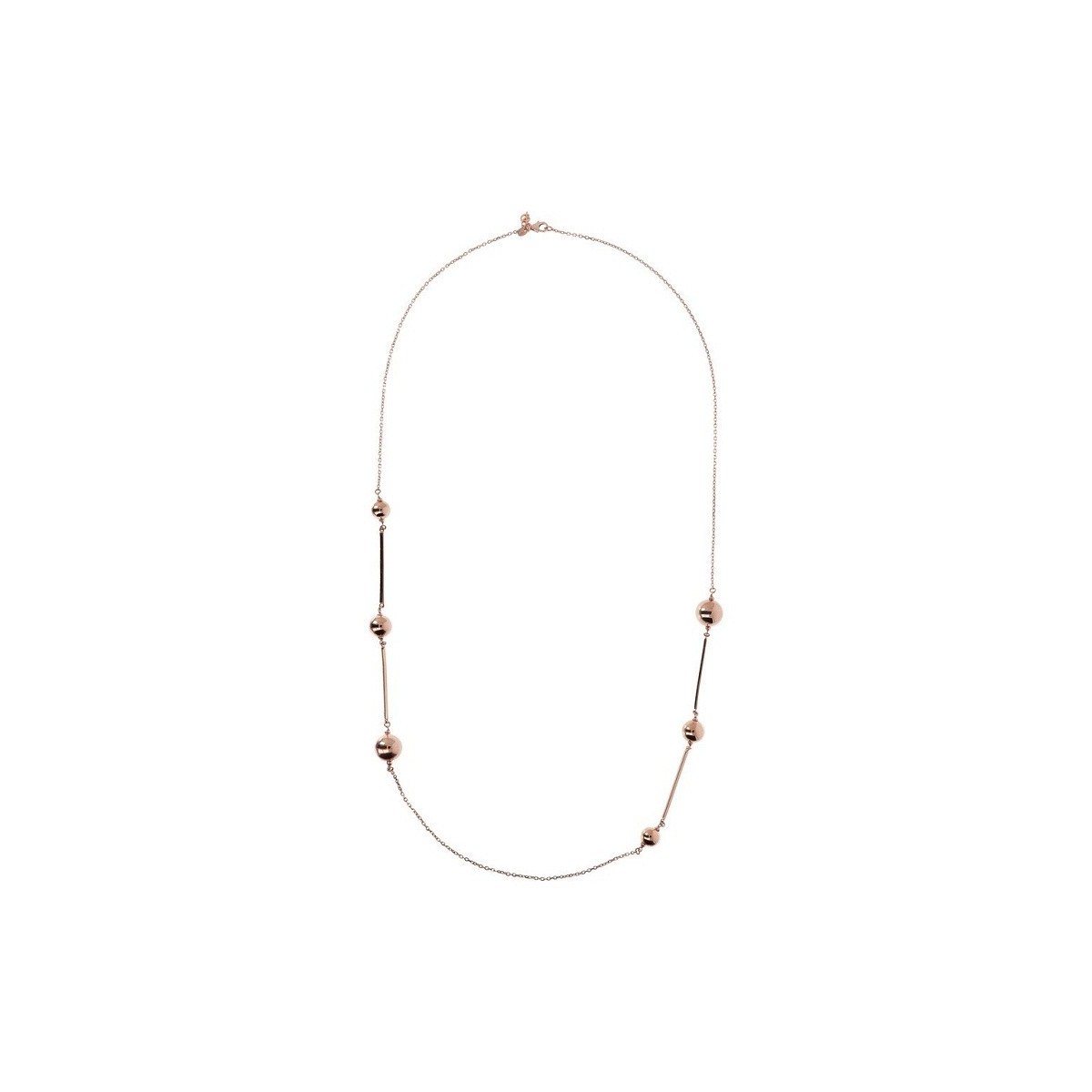 Lange Halskette, bestehend aus einer ovalen Grundkette, in der sich satinierte, kugelförmige Elemente und glänzende längliche Elemente befinden, die alle roségoldplattiert sind. Fein, elegant und raffiniert wird es Ihren Halsausschnitt mit Geschmack unterstreichen.