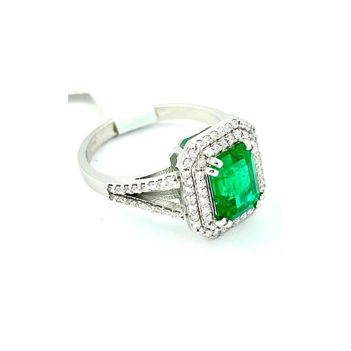 In diesen handgefertigten Ring mit einem besonders klassischen Stil hat unser Goldschmied einen erstaunlichen natürlichen Smaragd aus Kolumbien und genau aus der Muzo-Mine mit einem rechteckigen achteckigen Schliff, Smaragdschliff genannt, in eine solide und robuste Fassung aus 18 kt Weißgold eingefasst eine außergewöhnlich intensive hellgrüne Farbe und um dieses Juwel weiter zu verschönern, haben wir den Smaragd mit zwei Reihen natürlicher Diamanten im Brillantschliff sowie den Stiel umgeben