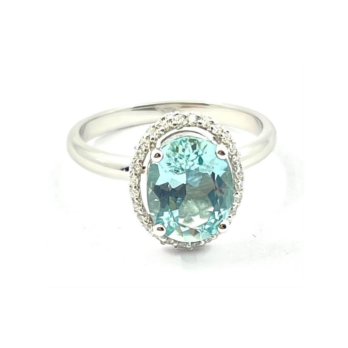 Ring aus 18 Karat Weißgold mit 1,46 Karat natürlichem grünem Aquamarin im Ovalschliff in der Mitte und einem Rand aus natürlichen Diamanten im Brillantschliff