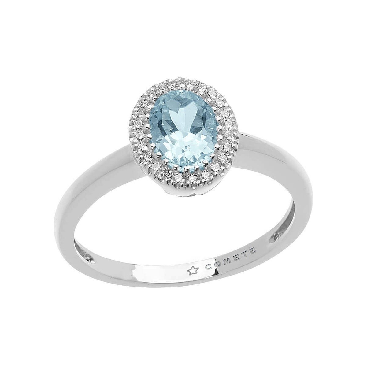 Comete Damenring aus der Azzurra Prestige Kollektion aus edlem 18kt Weißgold mit einem ovalen Aquamarin aus 0,80 Papierpapier umgeben und verziert mit 0,10 Karat runden Diamanten im Brillantschliff, Farbe G. Die Ringgröße beträgt 12