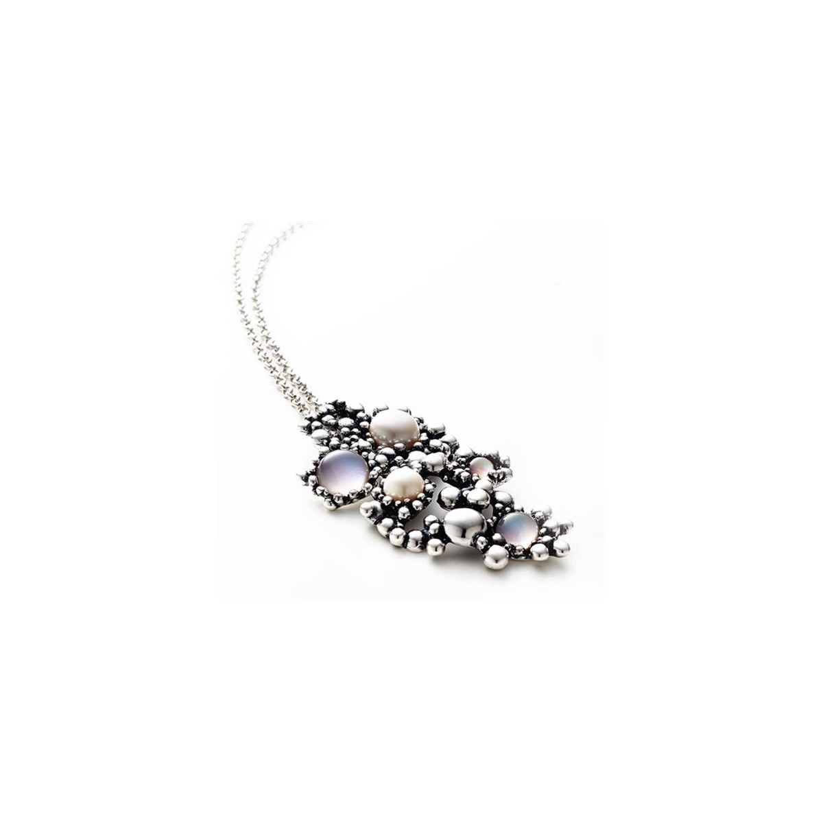 Lange Halskette aus der Sunrise-Kollektion aus 925er Silber und Anhänger mit Naturperlen, Quarz und Perlmutt.