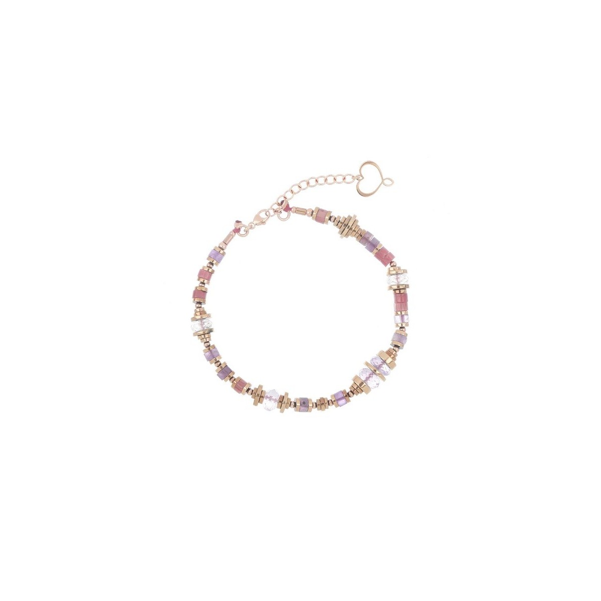 Armband aus der Maman Et Sophie Mother of Pearl-Kollektion für Damen. In 925 % Silber mit hoher Dicke und Widerstandsfähigkeit in Roségold galvanisiert und präsentiert kleine dekorative Kugeln und Scheibensteine aus violettem Amethyst, rosa Rhodochrosit und Rosenquarz, Zylinderabschnitte aus Apatit. Das Armband ist verstellbar. Hummerschere.