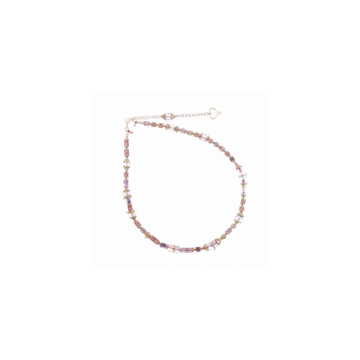 Halskette aus der Maman Et Sophie Mother of Pearl-Kollektion für Damen. In 925 % Silber mit hoher Dicke und Widerstandsfähigkeit in Roségold galvanisiert und präsentiert kleine dekorative Kugeln und Scheibensteine aus violettem Amethyst, rosa Rhodochrosit und Rosenquarz, Zylinderabschnitte aus Apatit. Die Halskette ist verstellbar. Hummerschere.