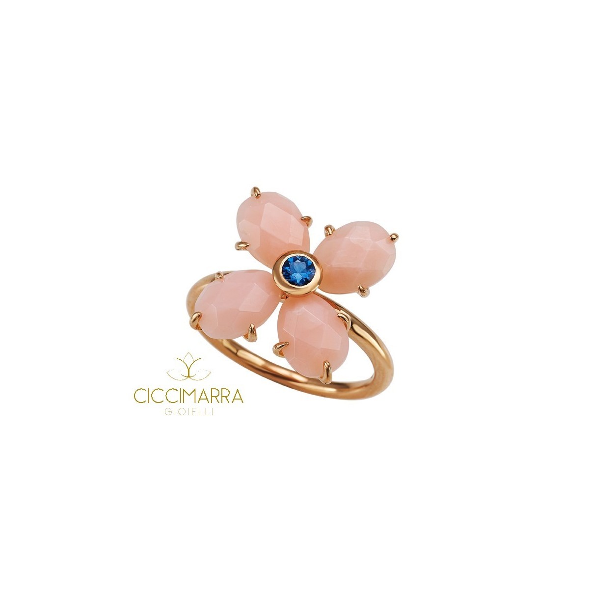Ring, Bloom Linie, Blume aus 18 Karat Roségold mit facettierten Blütenblättern in rosa Opal und Central Blue Sapphire - Code AXM111R8SZ5