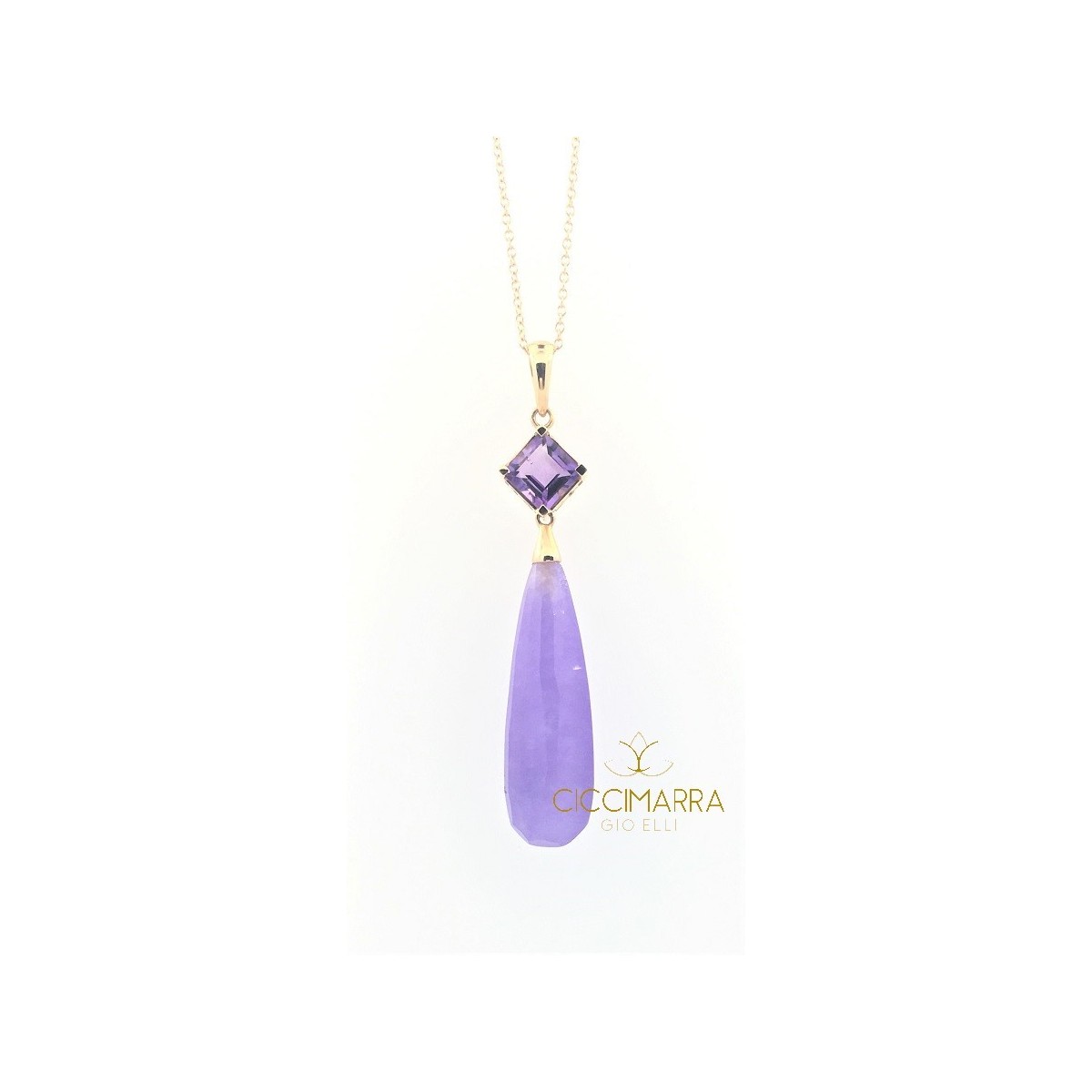 In dieser besonderen Version wird die Lavendel-Jade in Form eines länglichen Tropfens mit einem wundervollen violetten Carré-Amethyst kombiniert.