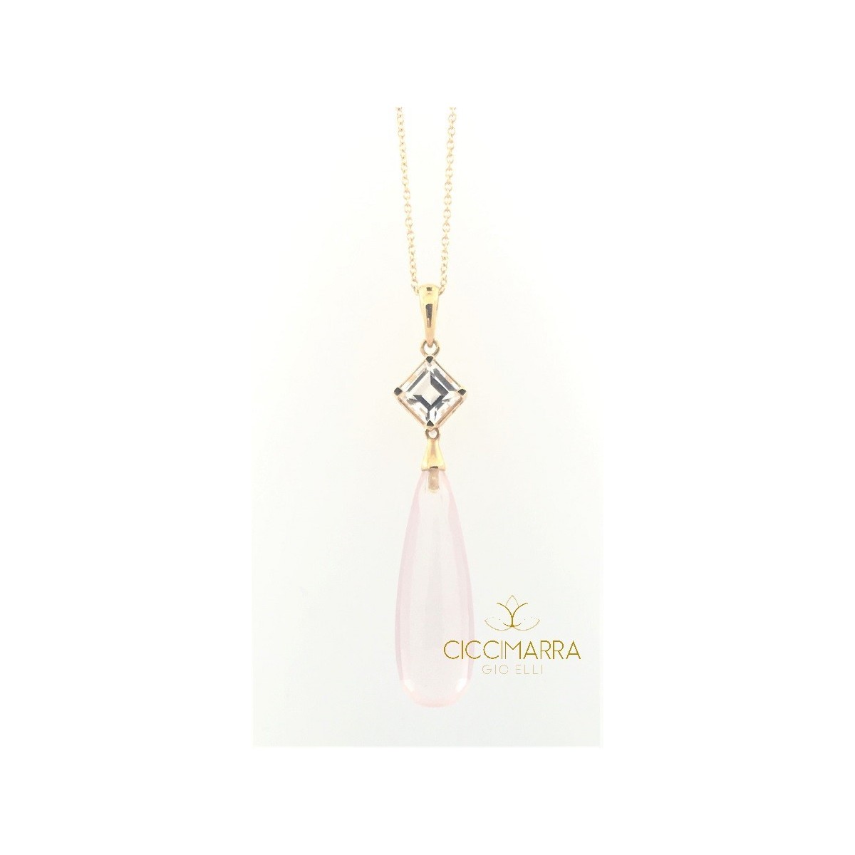 In dieser besonderen Version wird der Rosenquarz in Form eines länglichen Tropfens mit einem hellen farblosen weißen Saphirsaphir kombiniert.