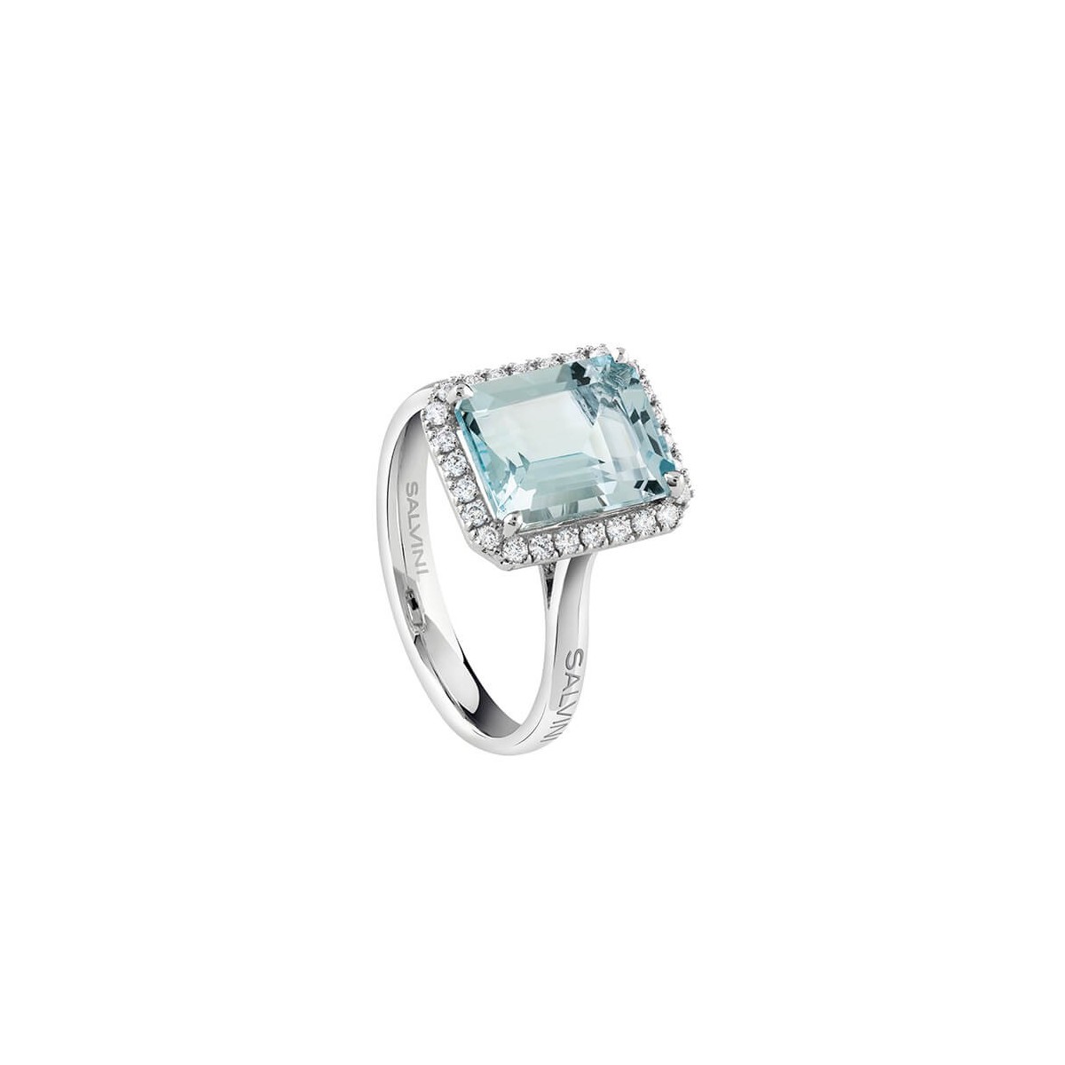 Damenring von Salvini aus der Sorrento-Kollektion aus 18 Karat Weißgold mit natürlichem Aquamarin in rechteckiger Form von ca. 10 x 8 mm, verziert mit einem Rahmen aus kleinen Diamanten von insgesamt 0,21 Karat. Größe 13