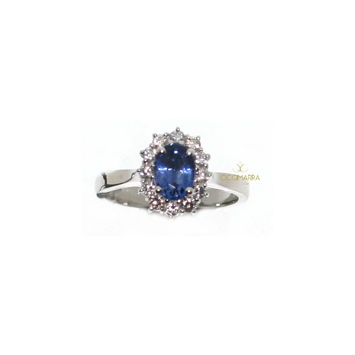 750/1000 Weißgold-Ring mit einem zentralen ovalen Saphir und zwölf Diamanten im Brillantschliff, die ihn umrahmen.