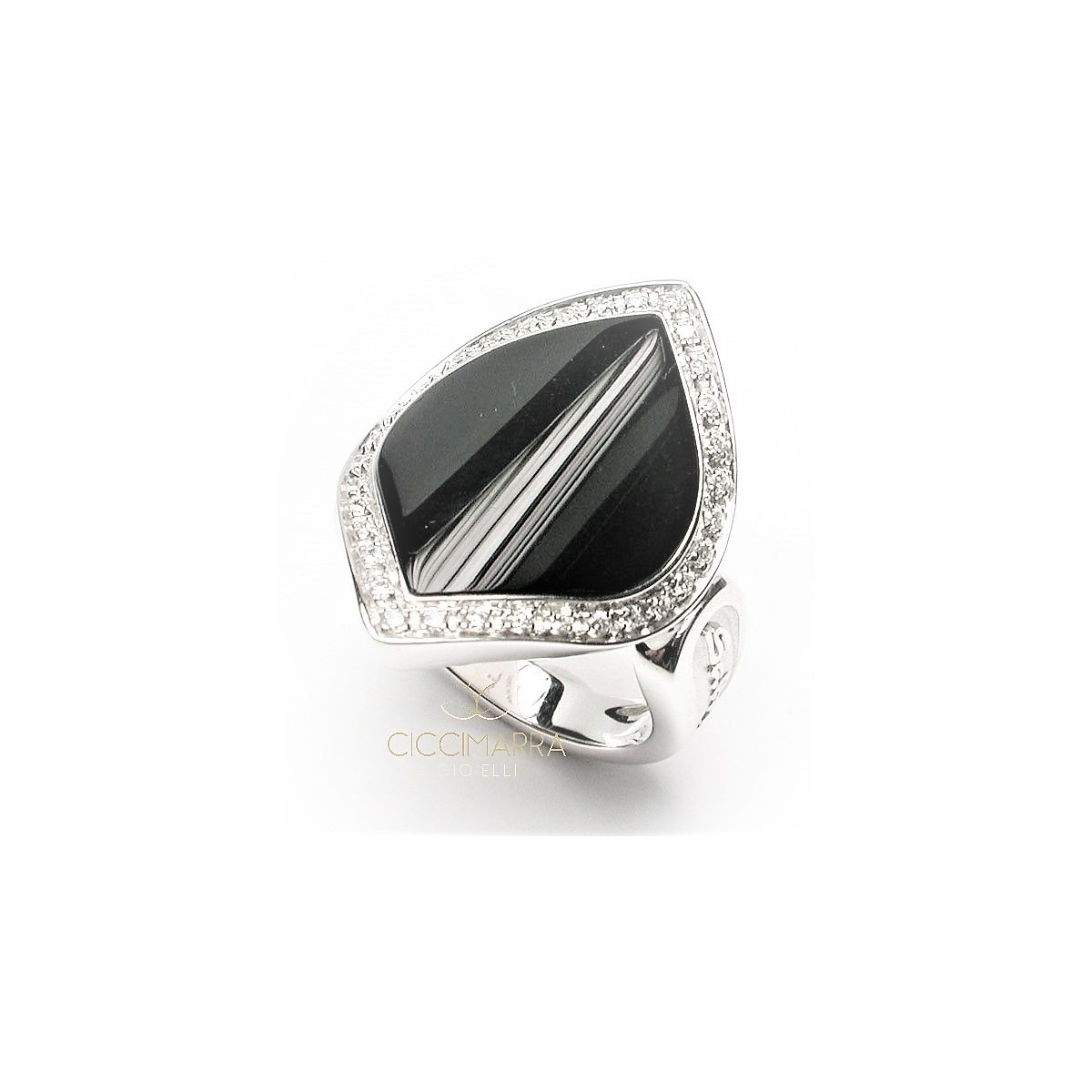 Ring der Times Square Kollektion aus 18 kt Weißgold mit breitem Band und zentraler Spitzverzierung mit zentralem Onyx und natürlichen Diamanten an der Kontur