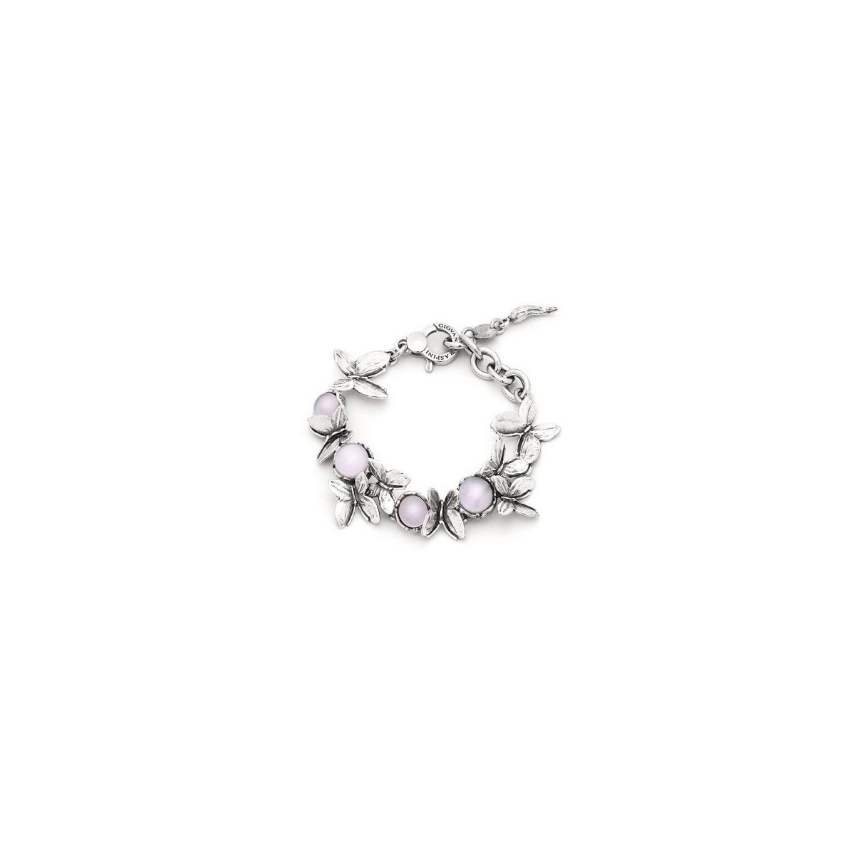 Wunderschönes Armband von Giovanni Raspini, das aus der zarten und doch faszinierenden Verbindung des unverwechselbaren brünierten Silbers und den Rosatönen der vier Cabochon-Steine aus Perlmutt und Quarz entsteht.