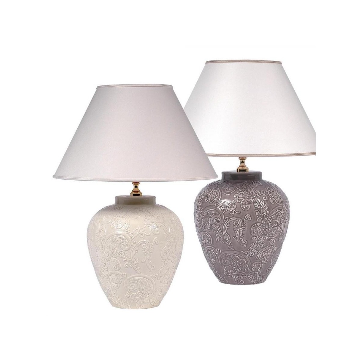 Abgerundete Tischlampe mit taubenfarbenem Porzellanrelief und Baumwolllampenschirm mit elfenbeinfarbener oder farblich passender h.30cm