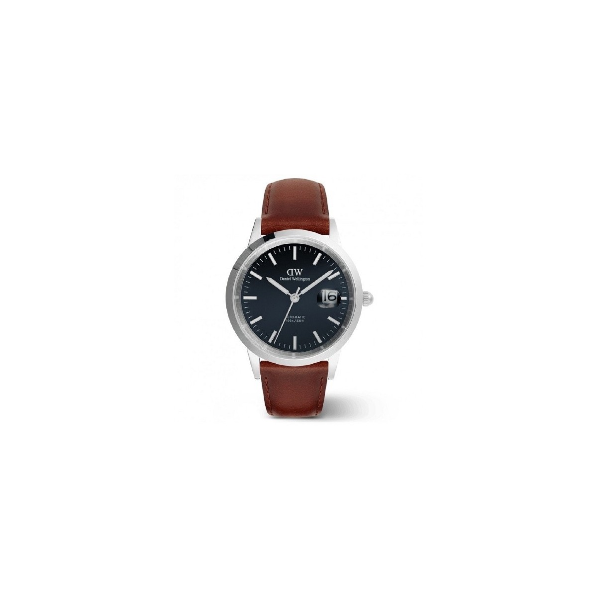 Daniel Wellington Herrenuhr aus der Iconic Link Automatic-Kollektion mit Nur-Zeit-Funktion mit Datum und Automatikwerk. Die Uhr besteht aus einem runden Edelstahlgehäuse mit einem Durchmesser von 40 mm. Blaues Zifferblatt mit leuchtenden Stabindexen und Datumsanzeige bei 3 Uhr mit Lupe, braunes Lederarmband; Dornschließe.