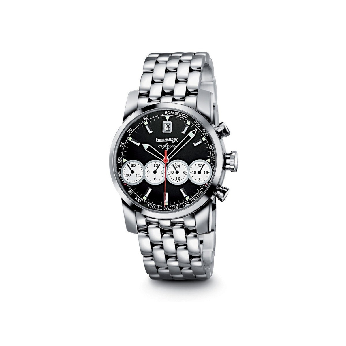 Eberhard Chono 4 Stahl Armband schwarzes Zifferblatt mit silbernen Saidi.