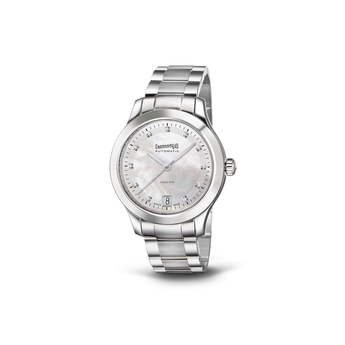 Aiglon Dame, Damenuhr mit 35 mm Stahlgehäuse und Armband. Automatikwerk nur Zeit mit Datum, Saphirglas, Perlmutt Zifferblatt mit Diamanten auf den Stundenmarkierungen.