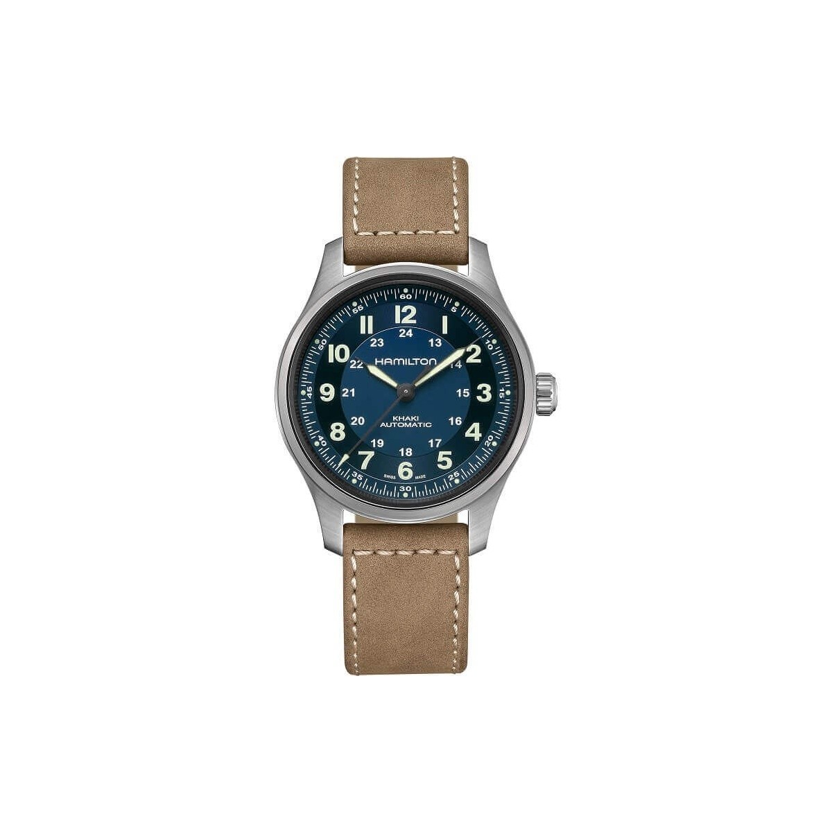 Hamilton Herrenuhr aus der Khaki Field Kollektion mit Zeitfunktion und Automatikwerk mit Gangreserve bis zu 80 Stunden. Die Uhr zeichnet sich durch ein schlichtes und zeitloses Design aus, gegeben durch das Armband aus beigefarbenem Rindsleder, 42 mm Titangehäuse mit aufrechtem Saphirglas mit kratzfester und entspiegelter Bearbeitung, blaues Zifferblatt mit LumiBrite-Zeigern, arabische Ziffern.