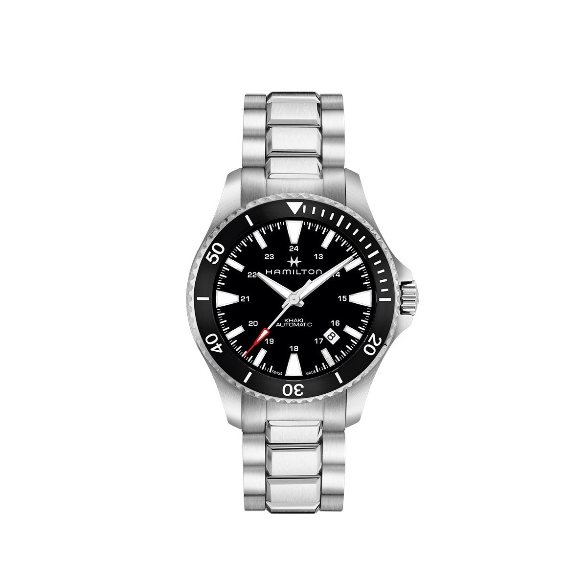 Khaki Navy Scuba Line Uhr mit automatischer mechanischer Bewegung mit 40mm schwarzem Zifferblatt, schwarzem Zifferblatt mit fluoreszierenden Linsen und Griffen und satiniertem Stahlarmband.in schwarz - H82335131