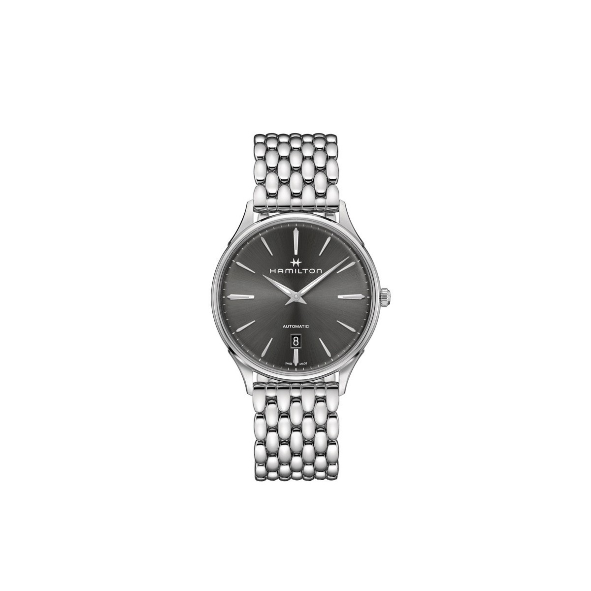 Die Hamilton Jazzmaster Thinline Automatic vereint ästhetische Eleganz mit Alltagstauglichkeit: 40 mm Edelstahlgehäuse, gut ablesbares schwarzes Zifferblatt und Edelstahlarmband im „Reiskorn“-Design sorgen für einen zeitlosen, eleganten Look.