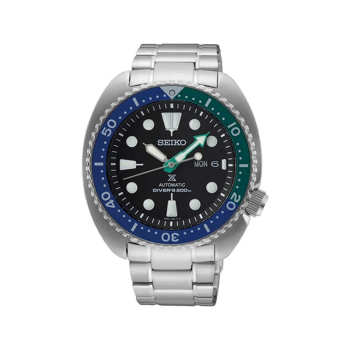 Herrenuhr aus der Prospex King Turtle Kollektion aus Stahl mit einem Gehäuse von 45 mm Durchmesser mit einer zweifarbigen grünen und azurblauen einseitig drehbaren schwarzen Lünette für die Sonderedition "Tropical Lagoon", schwarzem Zifferblatt mit LumiBrite-Indizes und -Zeigern für bessere Sichtbarkeit. Datumsanzeige bei 3 Uhr mit Lupe.
