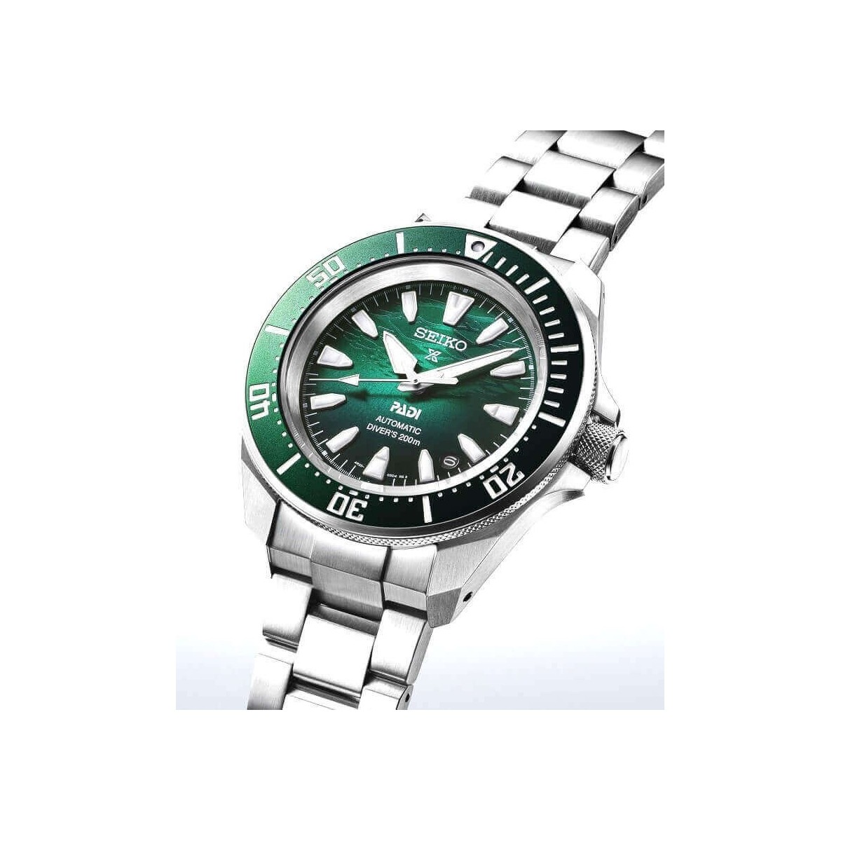 Herrenuhr, Dive Prospex PADI Edition-Linie, nur Automatikzeit mit 41,7 mm Samurai-Gehäuse und grünem Zifferblatt mit Wellenmotiv.