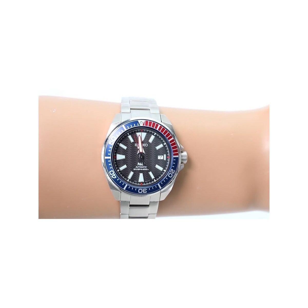 Herrenuhr mit Edelstahlgehäuse und -band, festem blauen und roten Ring, schwarzem Zifferblatt mit weißen Indizes und Zeigern, Datumsanzeige. Art des Uhrwerks: Automatisch mit Handaufzug, Dauer: ca. 41 Stunden; Gehäusematerial: Edelstahl; Glasmaterial: Hardlex; LumiBrite: LumiBrite auf Zeigern und Indexen; Schließen: Dreifachfaltschließe mit Sicherheitsverschluss, Knopfentriegelung mit Verlängerung; Wasserbeständigkeit: Unterwasser 200 m / 660 Fuß; Größe des Gehäuses: Dicke: 12,8 ", Durchmesser: 43,8"; Sonstige Angaben: verschraubter Rücken; Unidirektionale drehbare Lünette; Referenz: SRPB99K1