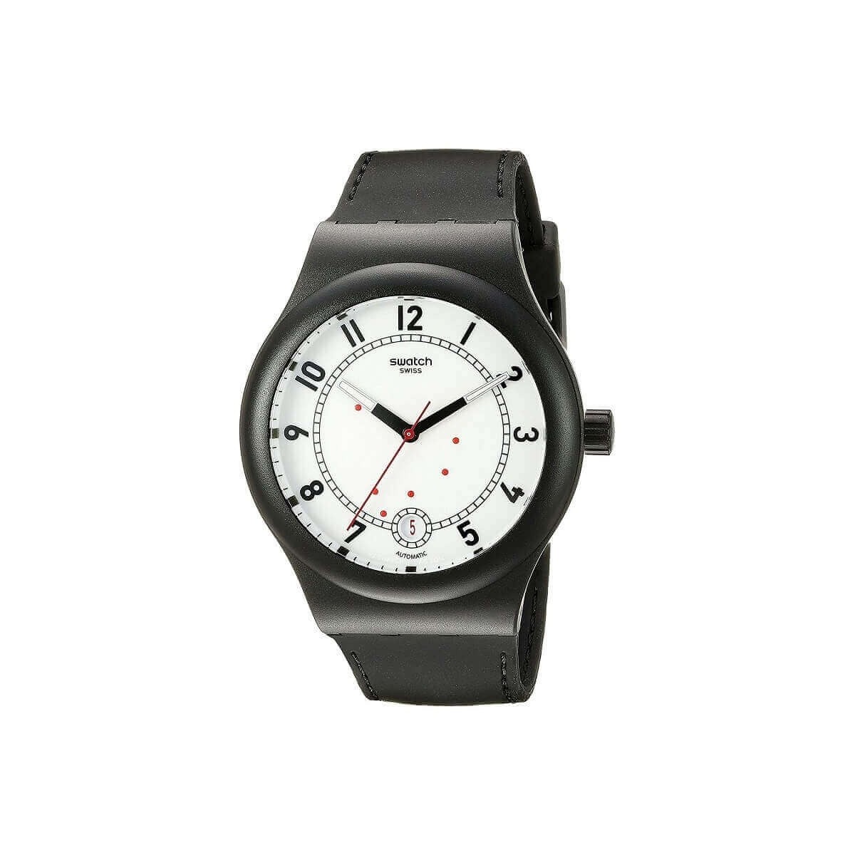 Swatch-Uhr aus der Sistem Chic-Kollektion mit Zeitfunktion und mechanischem Uhrwerk mit Automatikaufzug. Die Uhr hat ein schönes und jugendliches schwarzes Silikonarmband mit Kunststoffschnallenverschluss und großem schwarzem Gehäuse, weißes Zifferblatt mit schwarzen Zahlen und weiß / schwarzen und roten Zeigern.