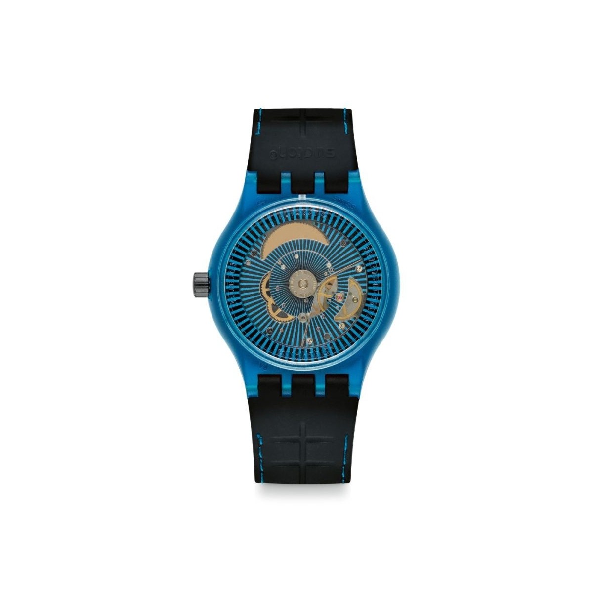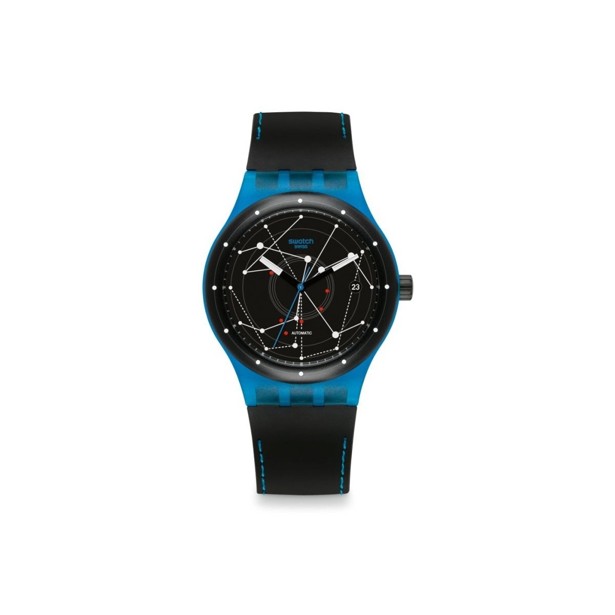 Systemuhr blau Swath mit automatischen Bewegung und Silikon Armband schwarz mit blauen Nähten Sistem 51 Sammlung aus der Schweiz zu 100 % mit einer Reichweite von 90 Stunden. Die Bewegung von 3 Hz hermetisch im Inneren der Kiste liefert ein präzises Arbeiten und lang anhaltende, die erfordert keine Wartung