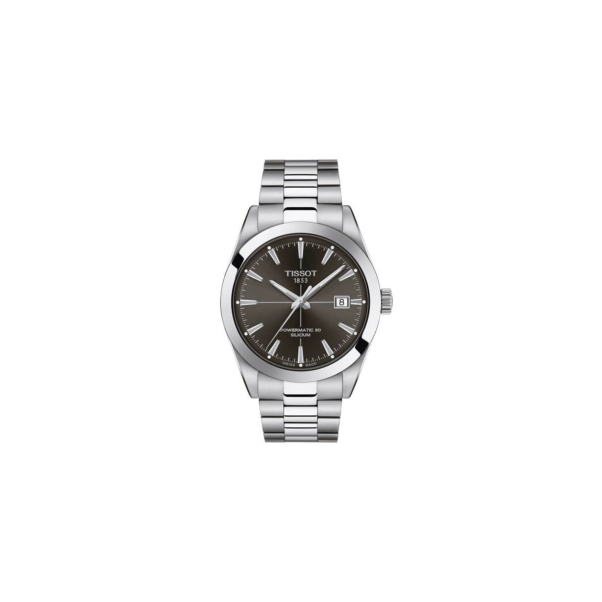 Herrenuhr aus der T-Gentleman-Linie mit Powermatic 80 Automatikwerk, 40 mm Gehäuse, anthrazitfarbenes Zifferblatt mit Stahlindizes und -zeigern, Datumsfenster.