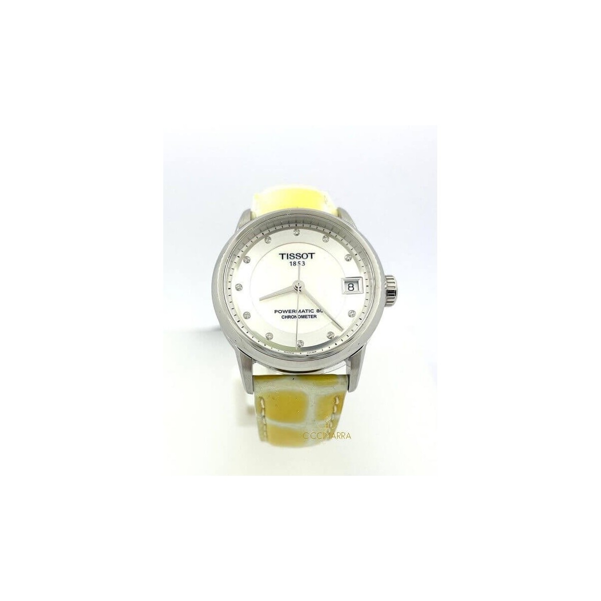 Luxuriöse Damenuhr von Tissot aus der T-Classic-Kollektion mit Automatikwerk, mit einem runden Gehäuse aus 316L-Stahl mit 33 mm Durchmesser und kratzfestem Saphirglas, das das weiße Perlmuttzifferblatt mit elf Diamanten anstelle der Indizes schützt Datumsfenster bei drei Uhr, mit gelbem Lederarmband mit Krokoprägung.