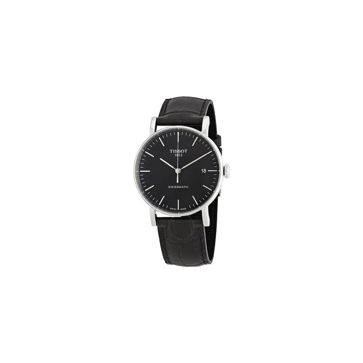 Everytime Swissmatic Tissot Herren-Zeituhr, aus der T-Classic-Kollektion, mit Automatikwerk, mit rundem Gehäuse mit einem Durchmesser von 40 mm aus 316L-Stahl, gewölbtem, kratzfestem Saphirglas, schwarzem Zifferblatt mit silbernen Indexen, Datumsanzeige bei drei o Uhr und Ansicht, schwarzes Lederarmband mit Standardschließe.